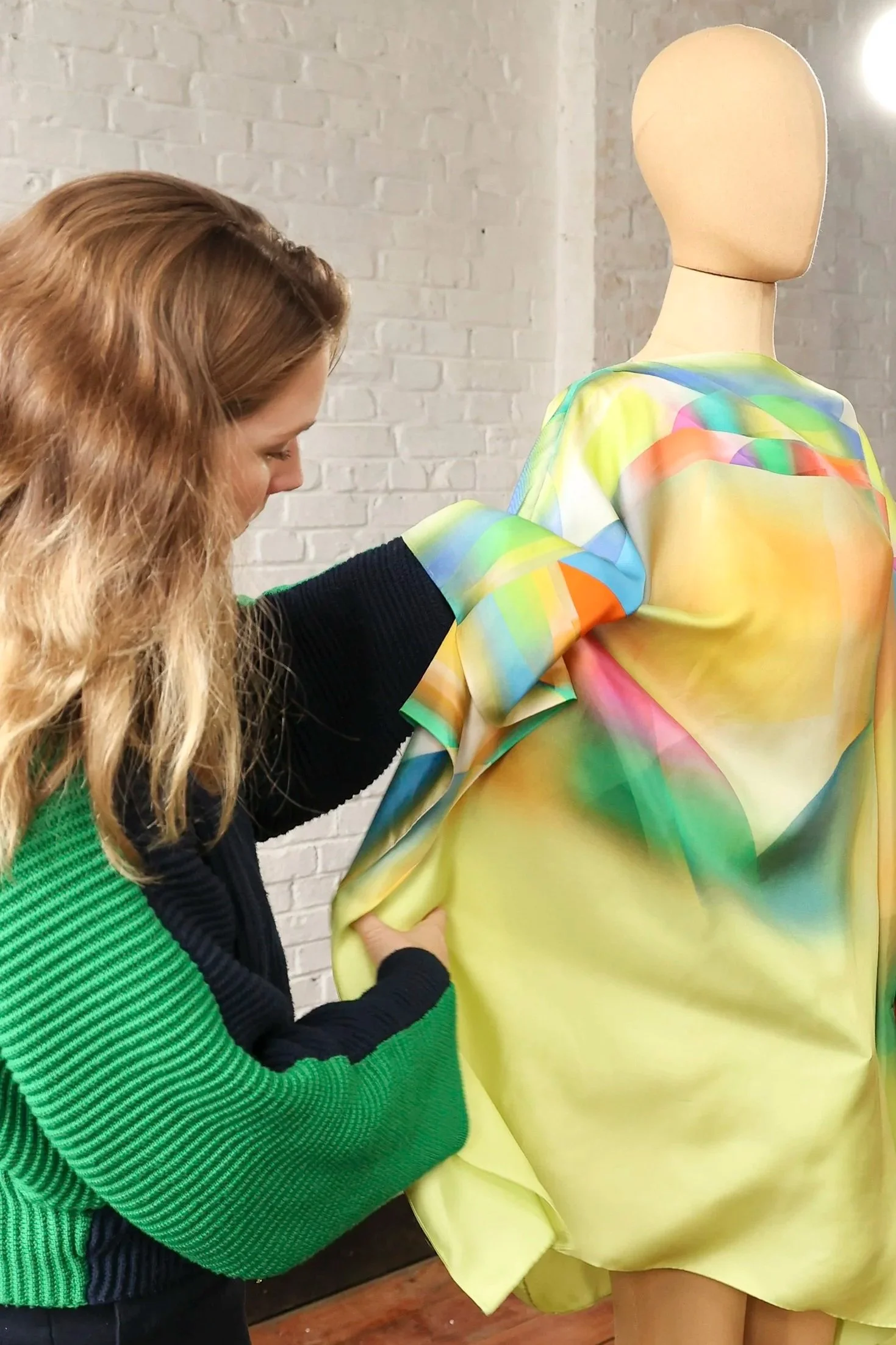 Marylène Madou's merk, dat ooit begon met zijden sjaals, is uitgegroeid tot een volwaardige kleding- en interieurcollectie. Ze werkt niet met traditionele seizoenen, maar met jaarthema's zoals 'De Tuinier' en 'De Hobbyist', wat haar de rust en ruimte geeft om diepgaand onderzoek te doen en unieke prints te ontwikkelen. Haar iconische kaftan, gebouwd rond twee vierkante sjaals, is een bestseller die zelfs door retailers gepersonaliseerd kan worden met prints uit haar archief.